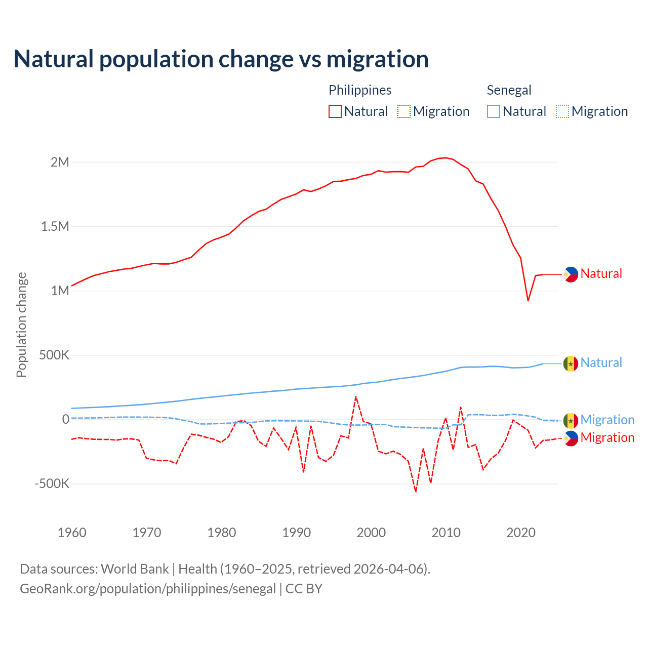 Over the last 10 years, 88.5% of the population change in the Philippines is from natural causes (a gain of 14,279,705 people) and 11.5% is from migration (a loss of 1,848,117 people). In Senegal 93.9% is from natural causes (a gain of 4,089,205 people) and 6.13% is from migration (a gain of 267,266 people).
