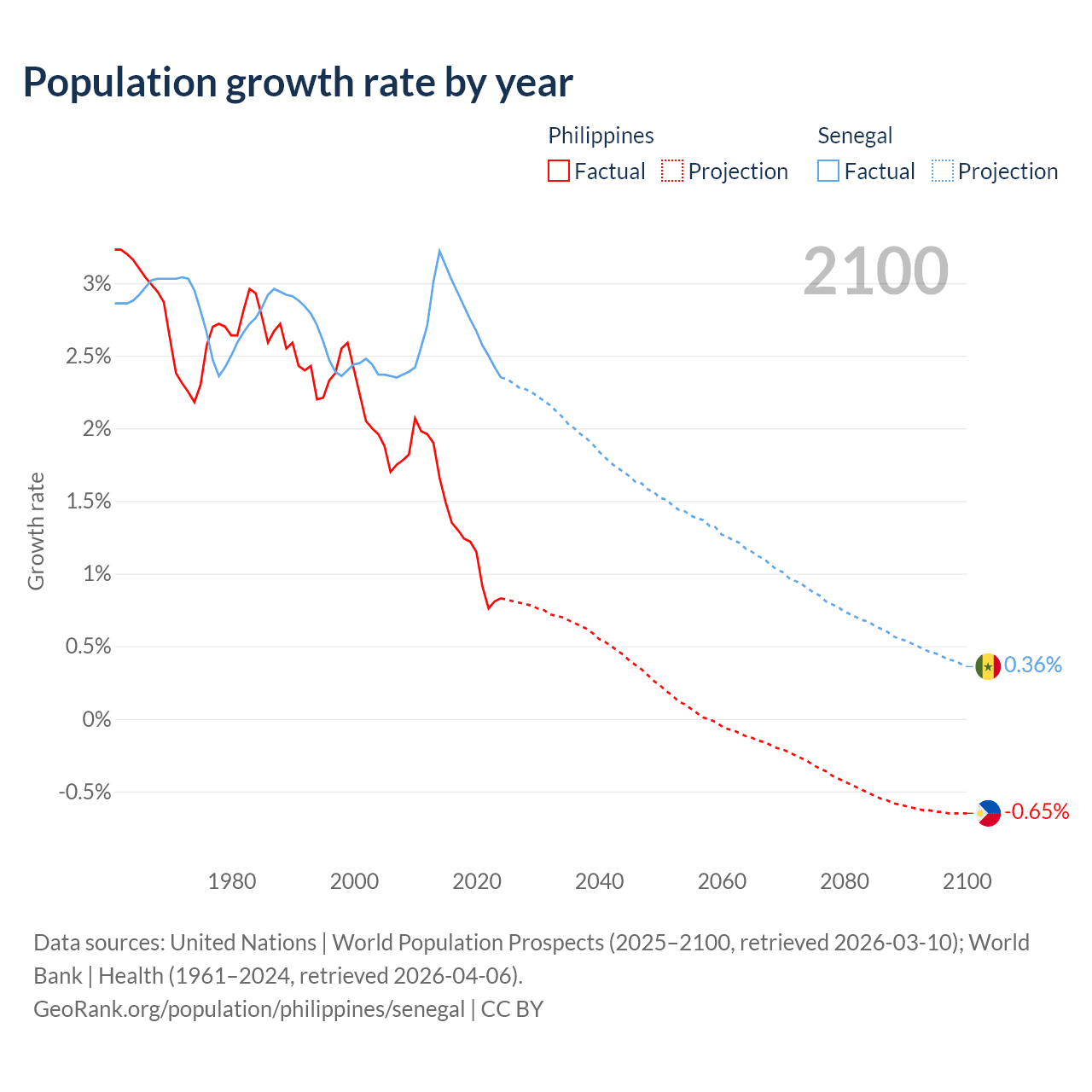 - For the last 10 years, the Philippines has had an average growth rate of +1.16% per year vs +2.76% in Senegal.