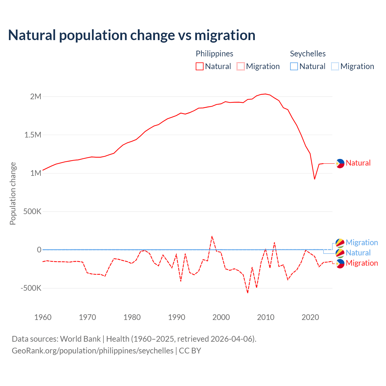 Over the last 10 years, 88.5% of the population change in the Philippines is from natural causes (a gain of 14,279,705 people) and 11.5% is from migration (a loss of 1,848,117 people). In the Seychelles 31.4% is from natural causes (a gain of 8,122 people) and 68.6% is from migration (a gain of 17,748 people).