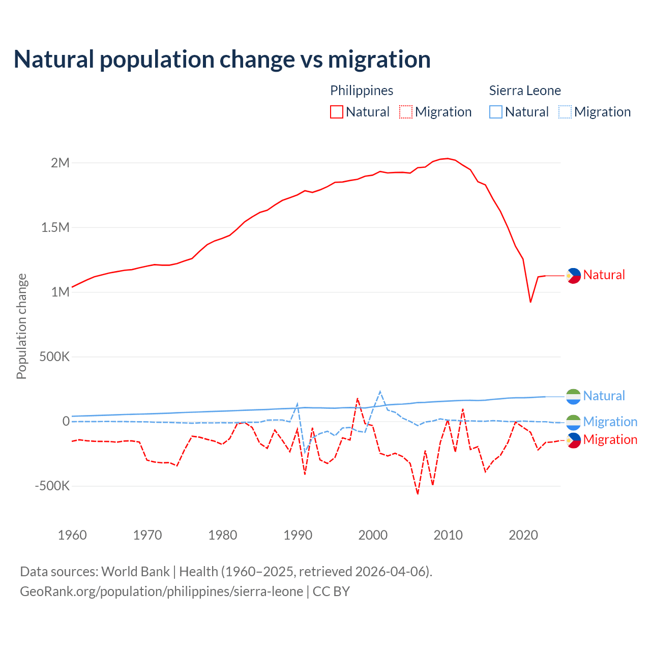 Over the last 10 years, 88.5% of the population change in the Philippines is from natural causes (a gain of 14,279,705 people) and 11.5% is from migration (a loss of 1,848,117 people). In Sierra Leone 99.6% is from natural causes (a gain of 1,764,049 people) and 0.41% is from migration (a loss of 7,211 people).