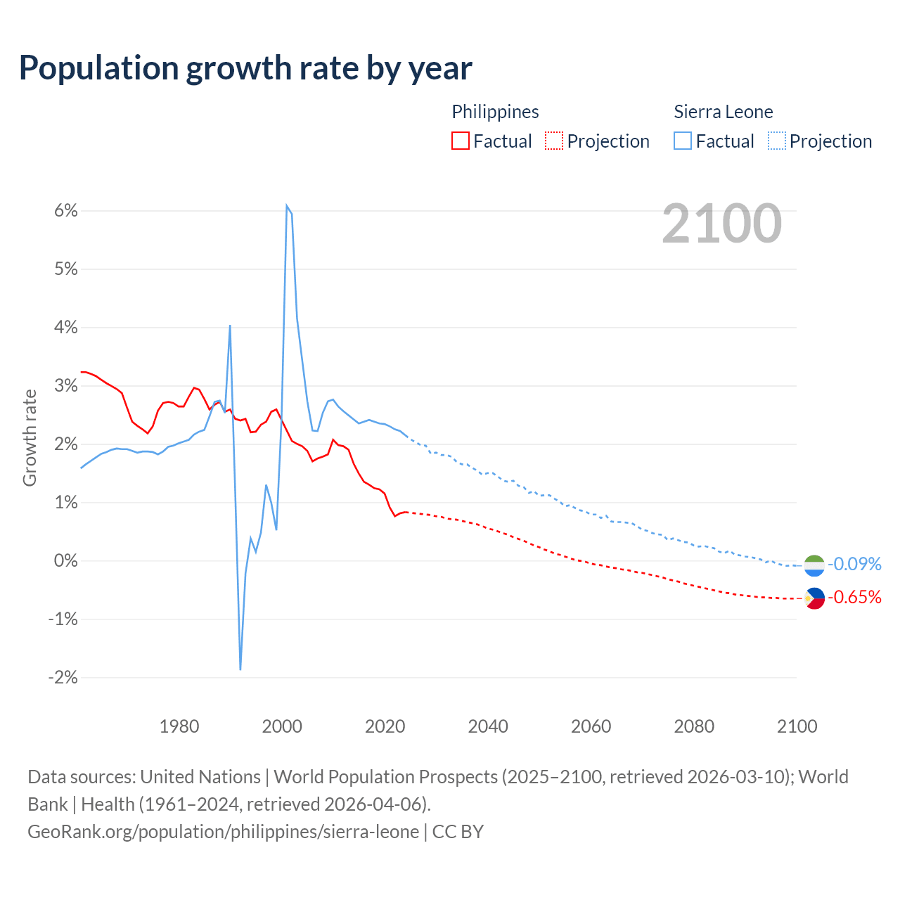 - For the last 10 years, the Philippines has had an average growth rate of +1.16% per year vs +2.32% in Sierra Leone.