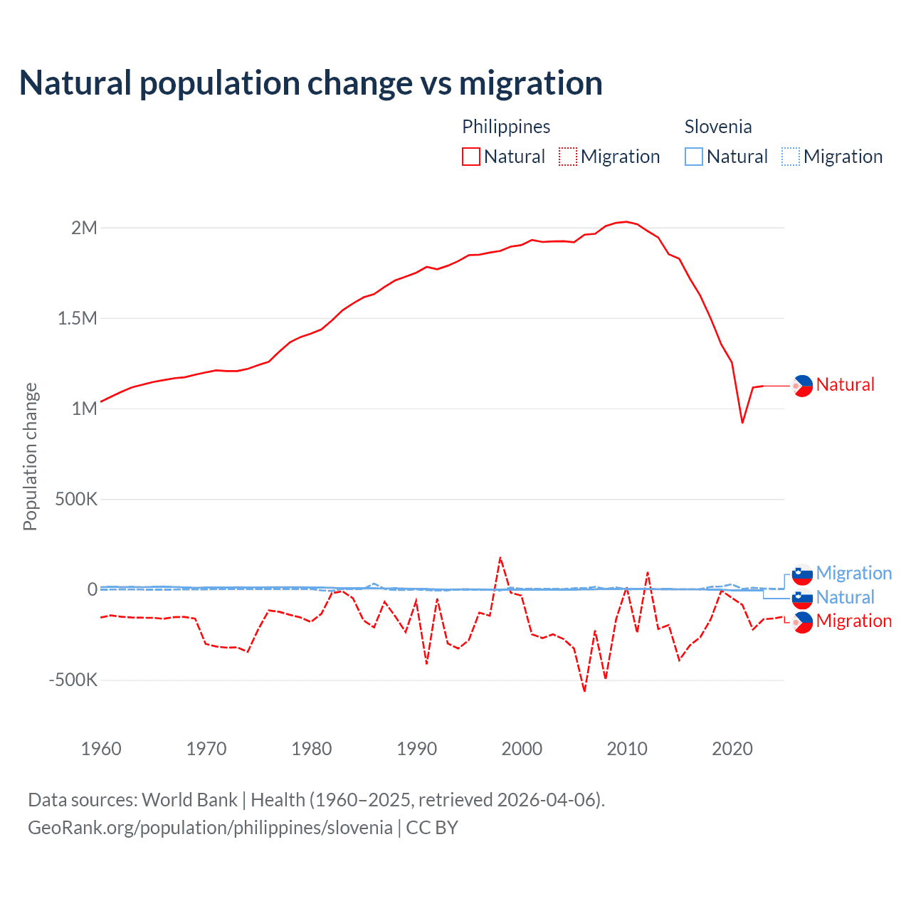 Over the last 10 years, 88.5% of the population change in the Philippines is from natural causes (a gain of 14,279,705 people) and 11.5% is from migration (a loss of 1,848,117 people). In Slovenia 18.1% is from natural causes (a loss of 17,573 people) and 81.9% is from migration (a gain of 79,532 people).