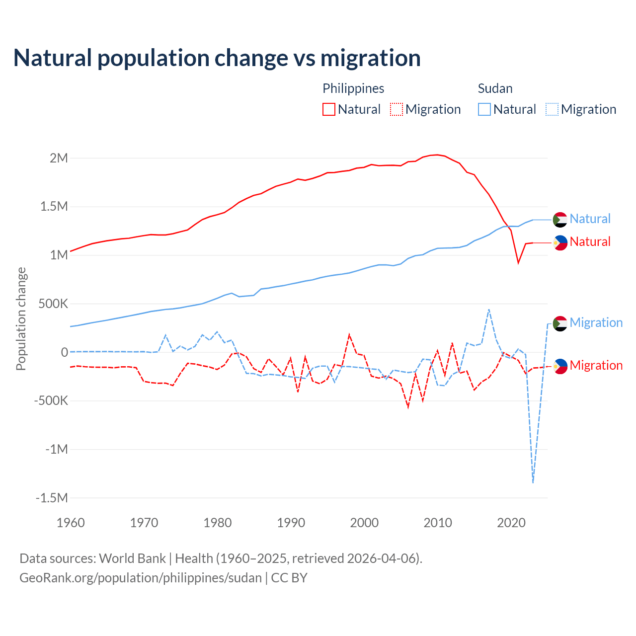 Over the last 10 years, 88.5% of the population change in the Philippines is from natural causes (a gain of 14,279,705 people) and 11.5% is from migration (a loss of 1,848,117 people). In Sudan 95.1% is from natural causes (a gain of 12,459,977 people) and 4.88% is from migration (a loss of 639,596 people).