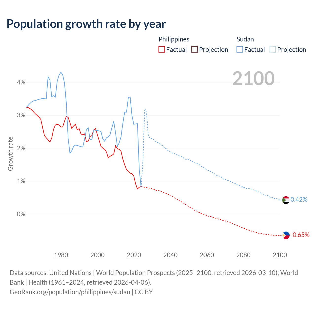 - For the last 10 years, the Philippines has had an average growth rate of +1.16% per year vs +2.67% in Sudan.