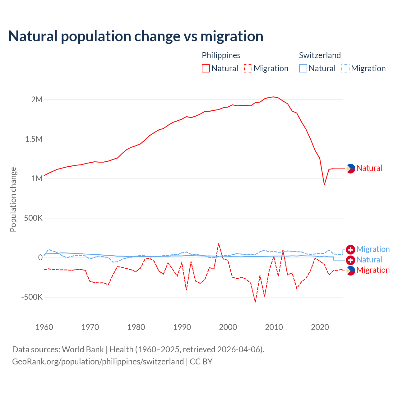 Over the last 10 years, 88.5% of the population change in the Philippines is from natural causes (a gain of 14,279,705 people) and 11.5% is from migration (a loss of 1,848,117 people). In Switzerland 21.6% is from natural causes (a gain of 165,354 people) and 78.4% is from migration (a gain of 600,145 people).