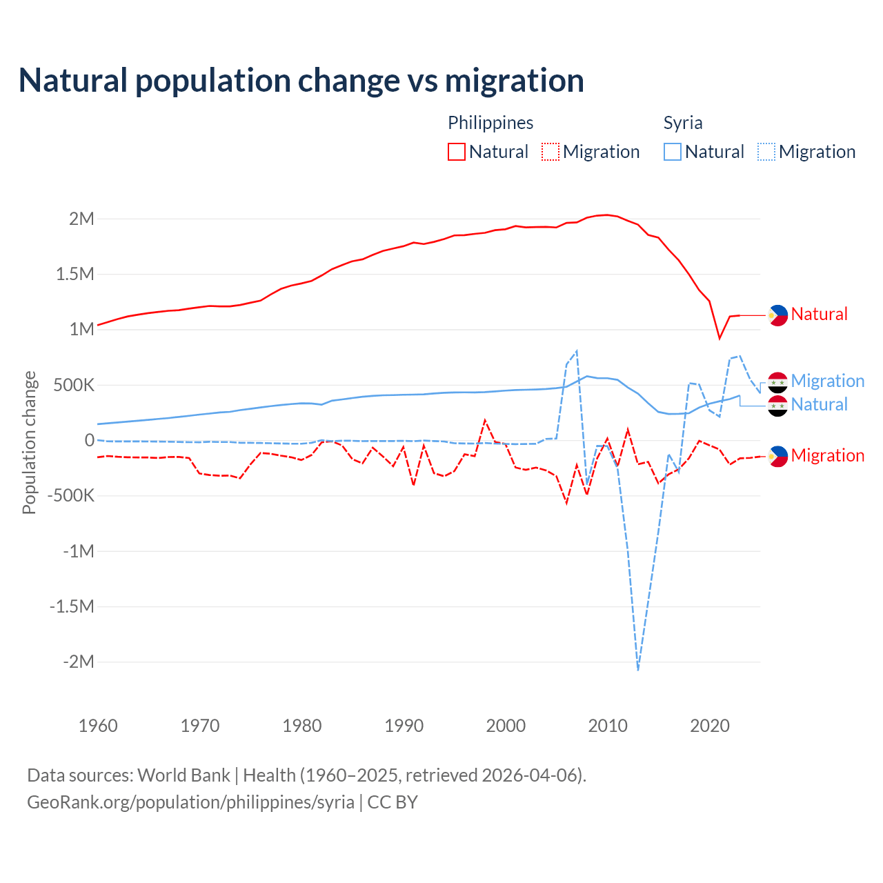 Over the last 10 years, 88.5% of the population change in the Philippines is from natural causes (a gain of 14,279,705 people) and 11.5% is from migration (a loss of 1,848,117 people). In Syria 91.3% is from natural causes (a gain of 3,047,621 people) and 8.72% is from migration (a gain of 291,069 people).