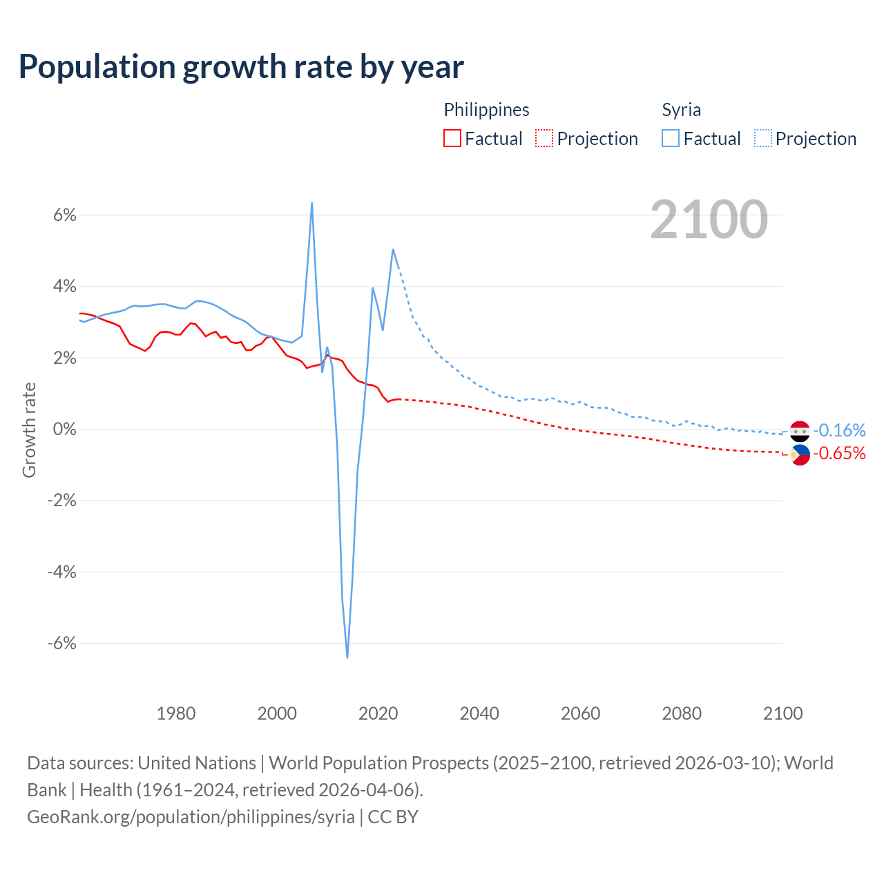 - For the last 10 years, the Philippines has had an average growth rate of +1.16% per year vs +1.25% in Syria.