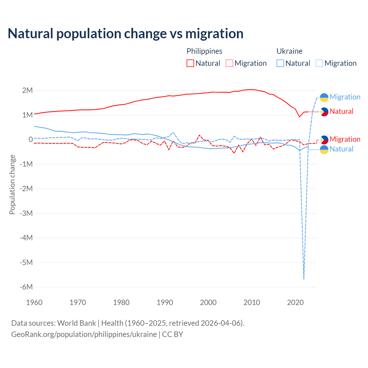 Over the last 10 years, 88.5% of the population change in the Philippines is from natural causes (a gain of 14,279,705 people) and 11.5% is from migration (a loss of 1,848,117 people). In Ukraine 28.2% is from natural causes (a loss of 2,435,153 people) and 71.8% is from migration (a loss of 6,198,995 people).