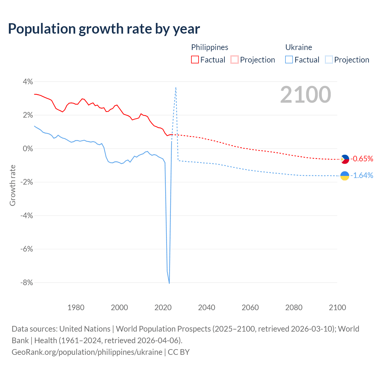 - For the last 10 years, the Philippines has had an average growth rate of +1.16% per year vs -1.74% in Ukraine.