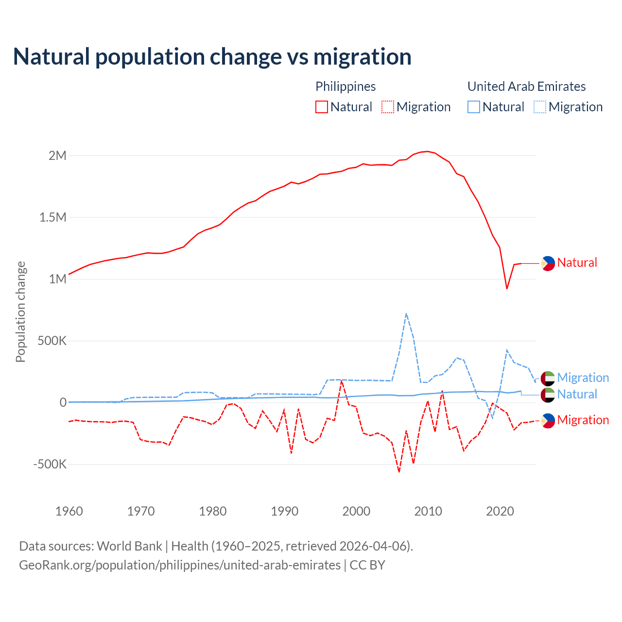 Over the last 10 years, 88.5% of the population change in the Philippines is from natural causes (a gain of 14,279,705 people) and 11.5% is from migration (a loss of 1,848,117 people). In the United Arab Emirates 30.5% is from natural causes (a gain of 857,996 people) and 69.5% is from migration (a gain of 1,958,520 people).