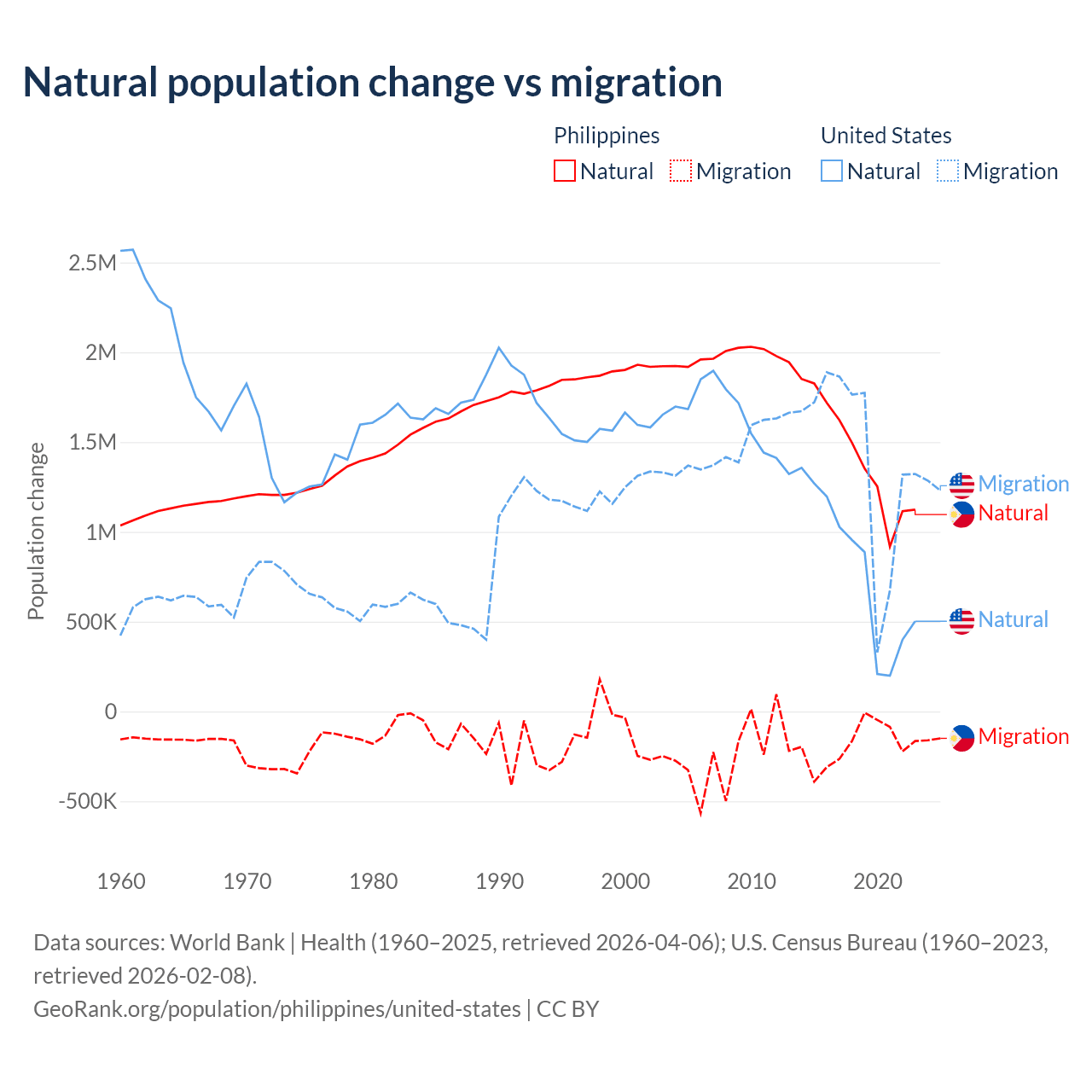 Over the last 10 years, 88.5% of the population change in the Philippines is from natural causes (a gain of 14,279,705 people) and 11.5% is from migration (a loss of 1,848,117 people). In the United States 35.8% is from natural causes (a gain of 8,005,866 people) and 64.2% is from migration (a gain of 14,334,286 people).