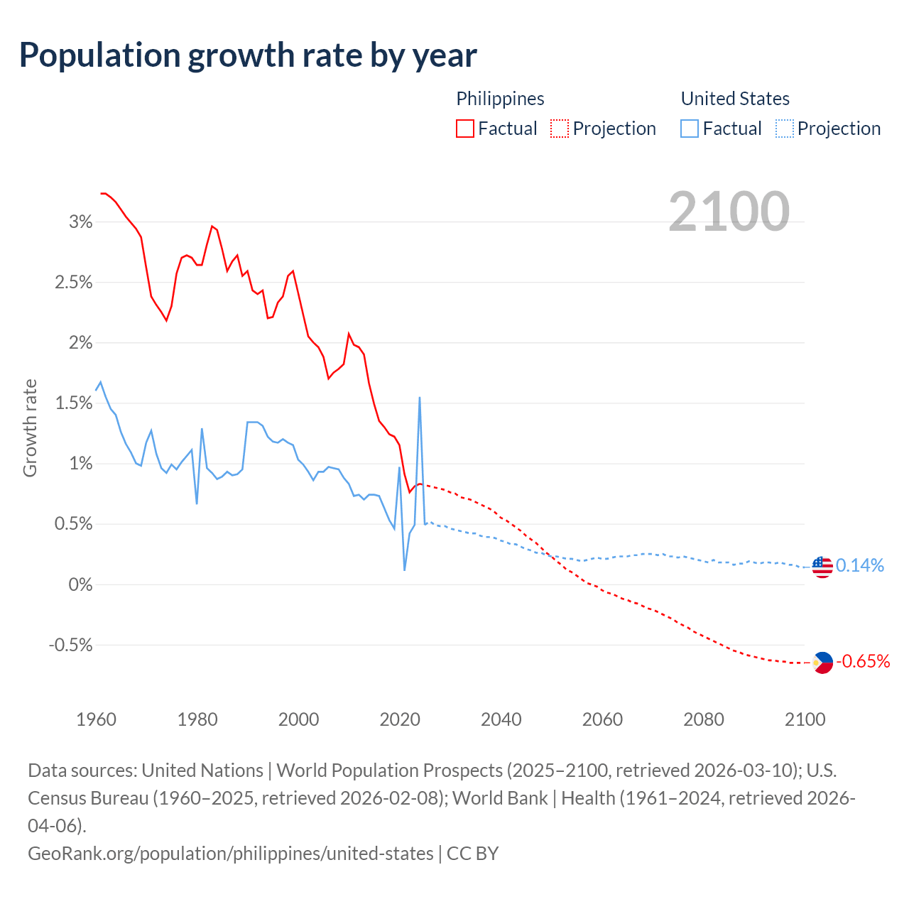 - For the last 10 years, the Philippines has had an average growth rate of +1.16% per year vs +0.65% in the United States.