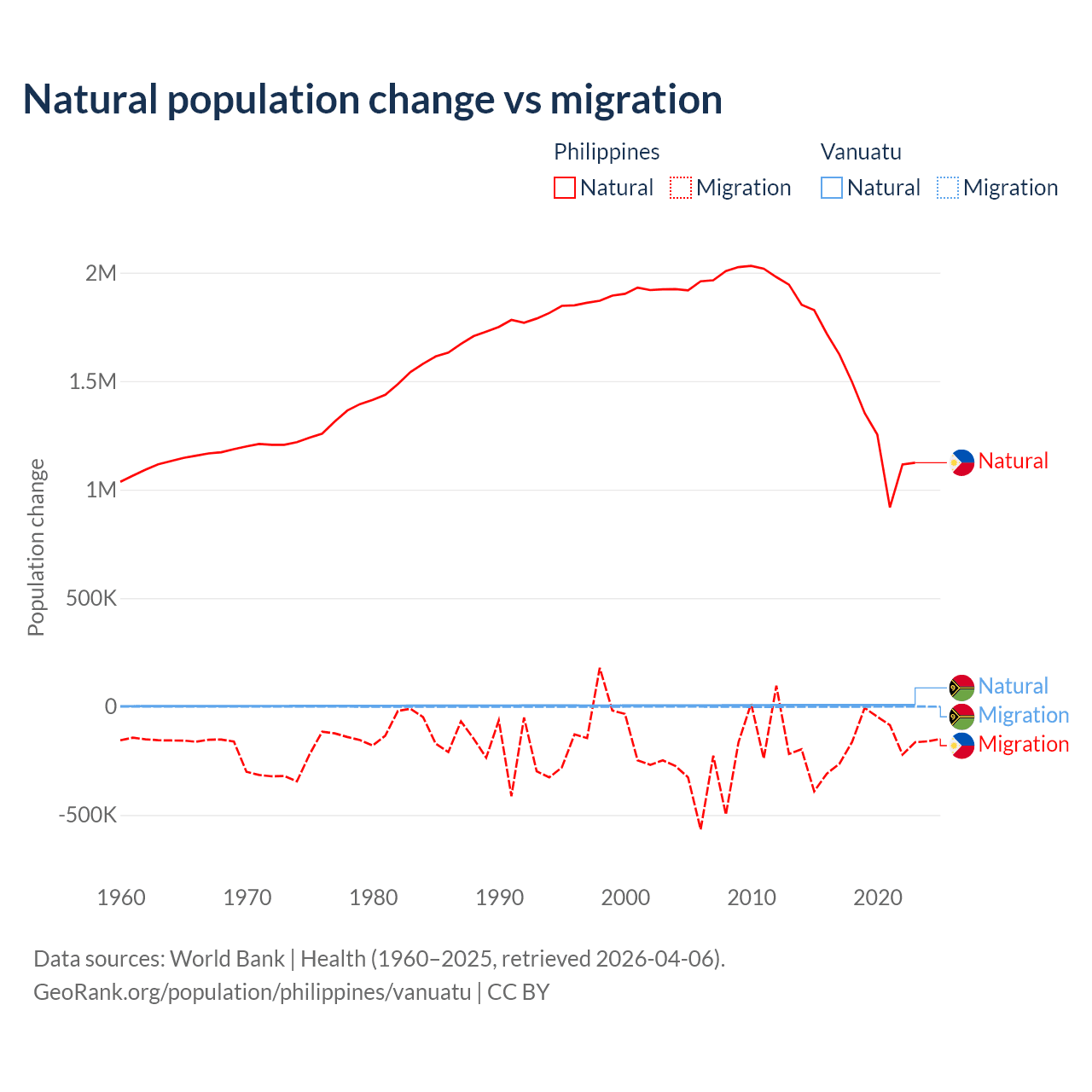 Over the last 10 years, 88.5% of the population change in the Philippines is from natural causes (a gain of 14,279,705 people) and 11.5% is from migration (a loss of 1,848,117 people). In Vanuatu 92.2% is from natural causes (a gain of 72,941 people) and 7.81% is from migration (a loss of 6,181 people).