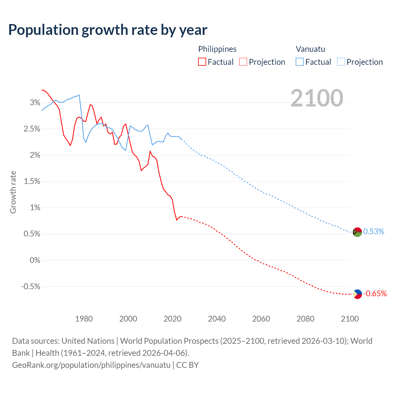 - For the last 10 years, the Philippines has had an average growth rate of +1.16% per year vs +2.33% in Vanuatu.