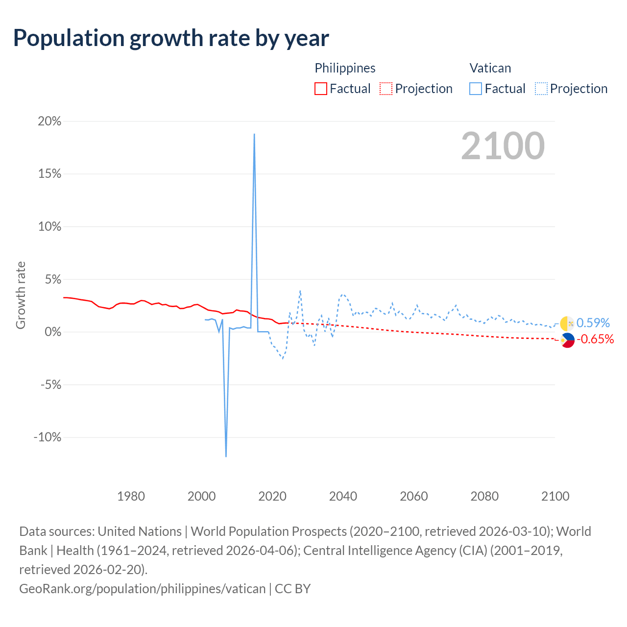 Data sources: World Bank | Health (1960–2024, retrieved 2026-04-06); United Nations | World Population Prospects (1960–2026, retrieved 2026-03-10); U.S. Census Bureau (1960–2025, retrieved 2026-02-08); Central Intelligence Agency (CIA) (2000–2019, retrieved 2026-02-20).