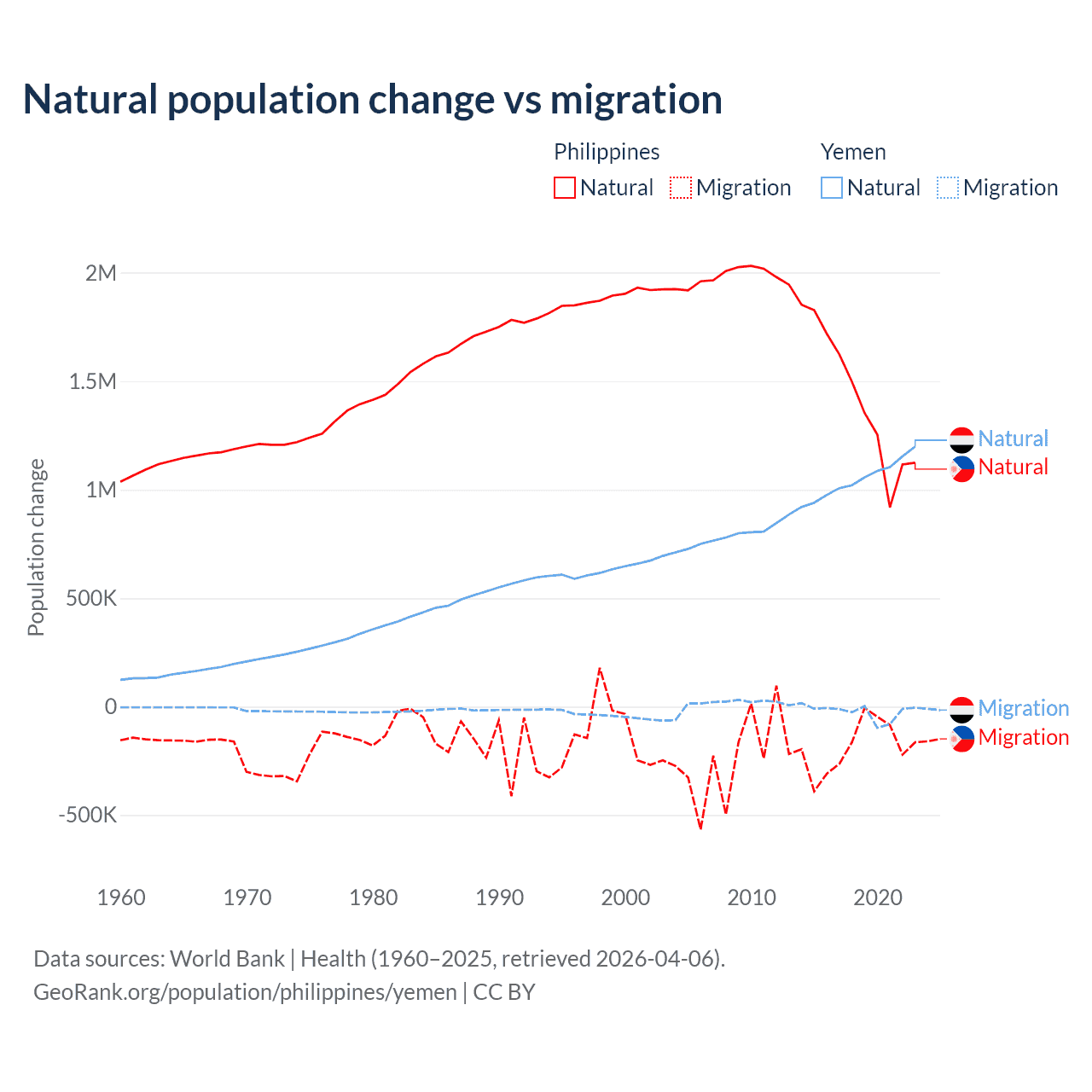 Over the last 10 years, 88.5% of the population change in the Philippines is from natural causes (a gain of 14,279,705 people) and 11.5% is from migration (a loss of 1,848,117 people). In Yemen 97.8% is from natural causes (a gain of 10,460,813 people) and 2.17% is from migration (a loss of 231,814 people).