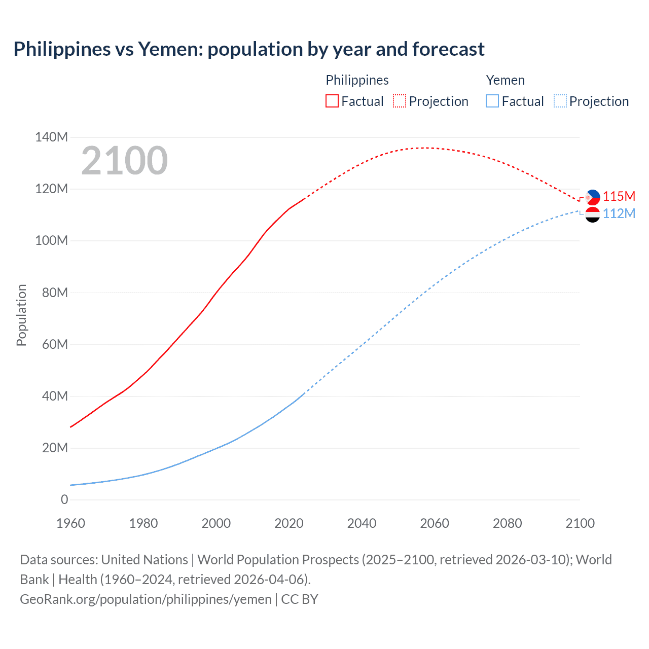 The latest officially reported population of the Philippines was 115,843,670 in 2024 vs 40,583,164 people in Yemen in 2024. In 2026, based on the adjusted UN estimation, the current Philippines' population is 117,991,570 people compared to 43,325,643 in Yemen.