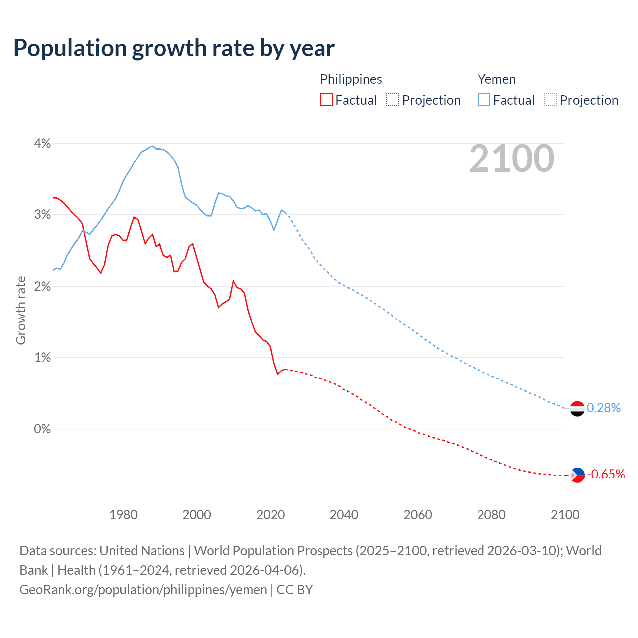 - For the last 10 years, the Philippines has had an average growth rate of +1.16% per year vs +3% in Yemen.