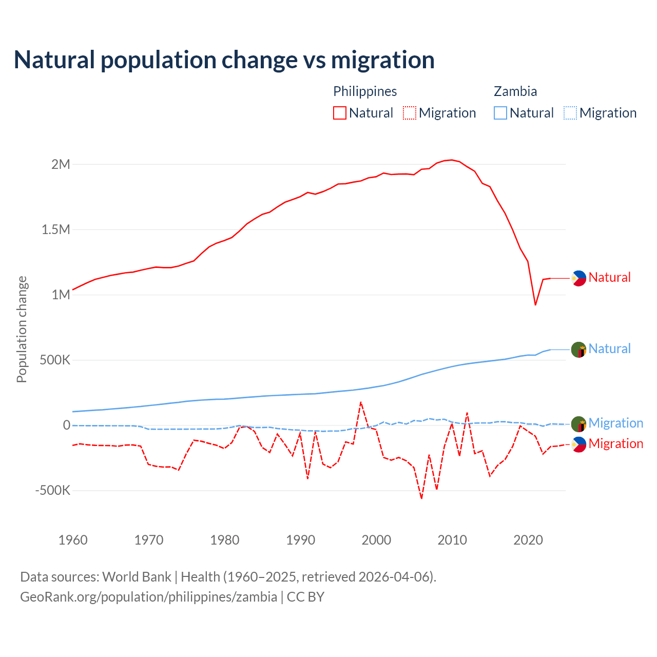 Over the last 10 years, 88.5% of the population change in the Philippines is from natural causes (a gain of 14,279,705 people) and 11.5% is from migration (a loss of 1,848,117 people). In Zambia 97.4% is from natural causes (a gain of 5,233,797 people) and 2.58% is from migration (a gain of 138,554 people).