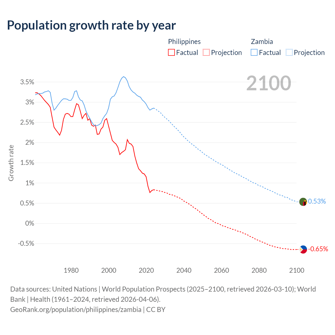 - For the last 10 years, the Philippines has had an average growth rate of +1.16% per year vs +3% in Zambia.