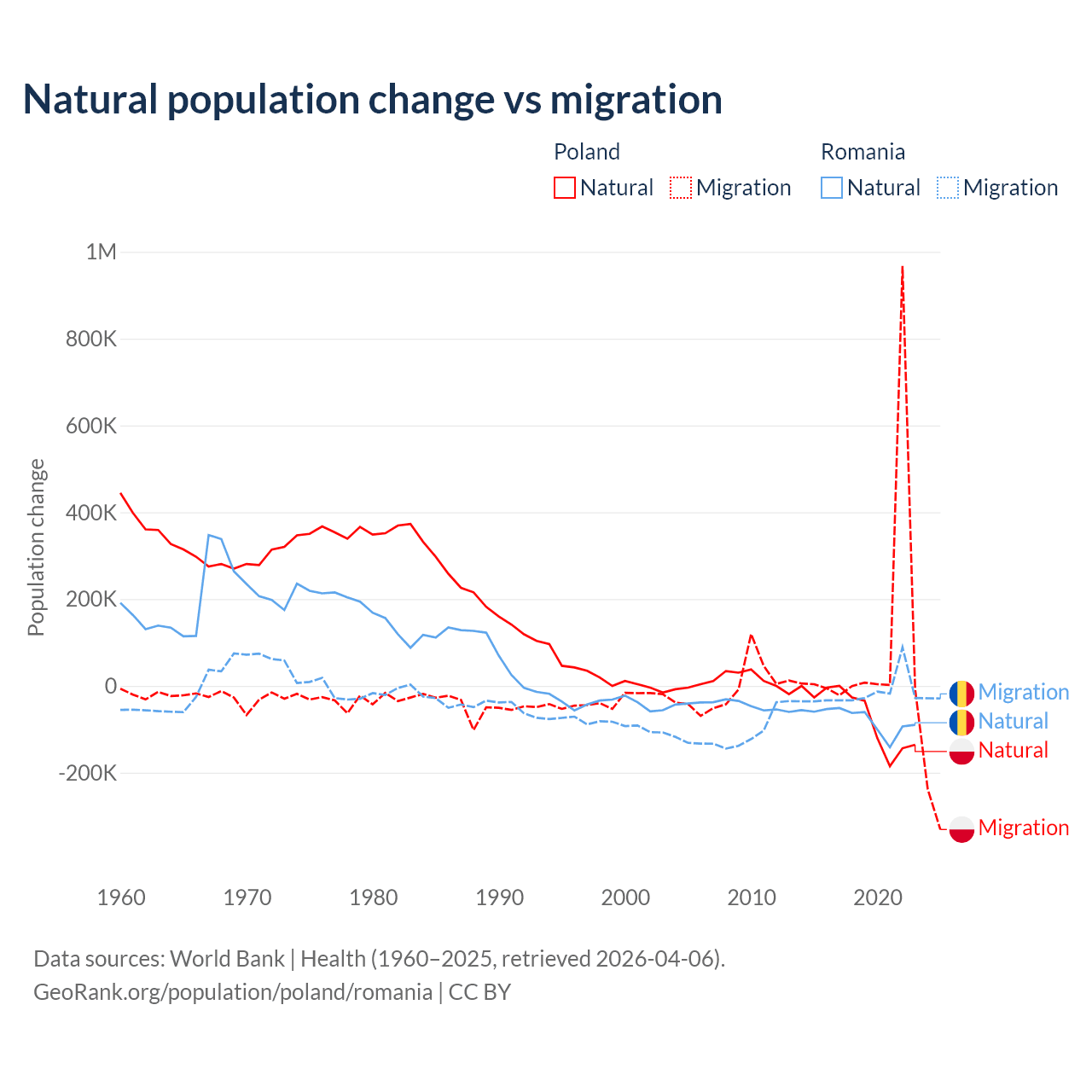 Over the last 10 years, 41.4% of the population change in Poland is from natural causes (a loss of 675,443 people) and 58.6% is from migration (a gain of 955,766 people). In Romania 82% is from natural causes (a loss of 766,295 people) and 18% is from migration (a loss of 167,917 people).