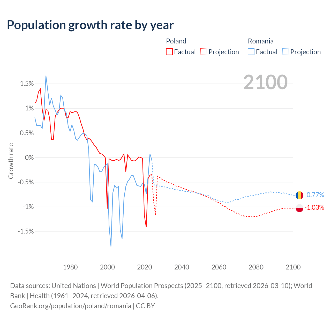 - For the last 10 years, Poland has had an average growth rate of -0.36% per year vs -0.43% in Romania.