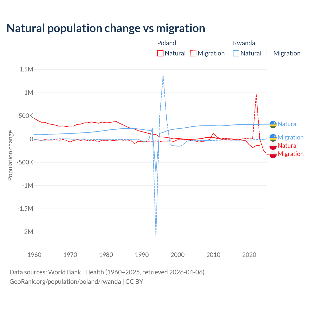Over the last 10 years, 41.4% of the population change in Poland is from natural causes (a loss of 675,443 people) and 58.6% is from migration (a gain of 955,766 people). In Rwanda 93.8% is from natural causes (a gain of 3,081,296 people) and 6.18% is from migration (a loss of 203,035 people).