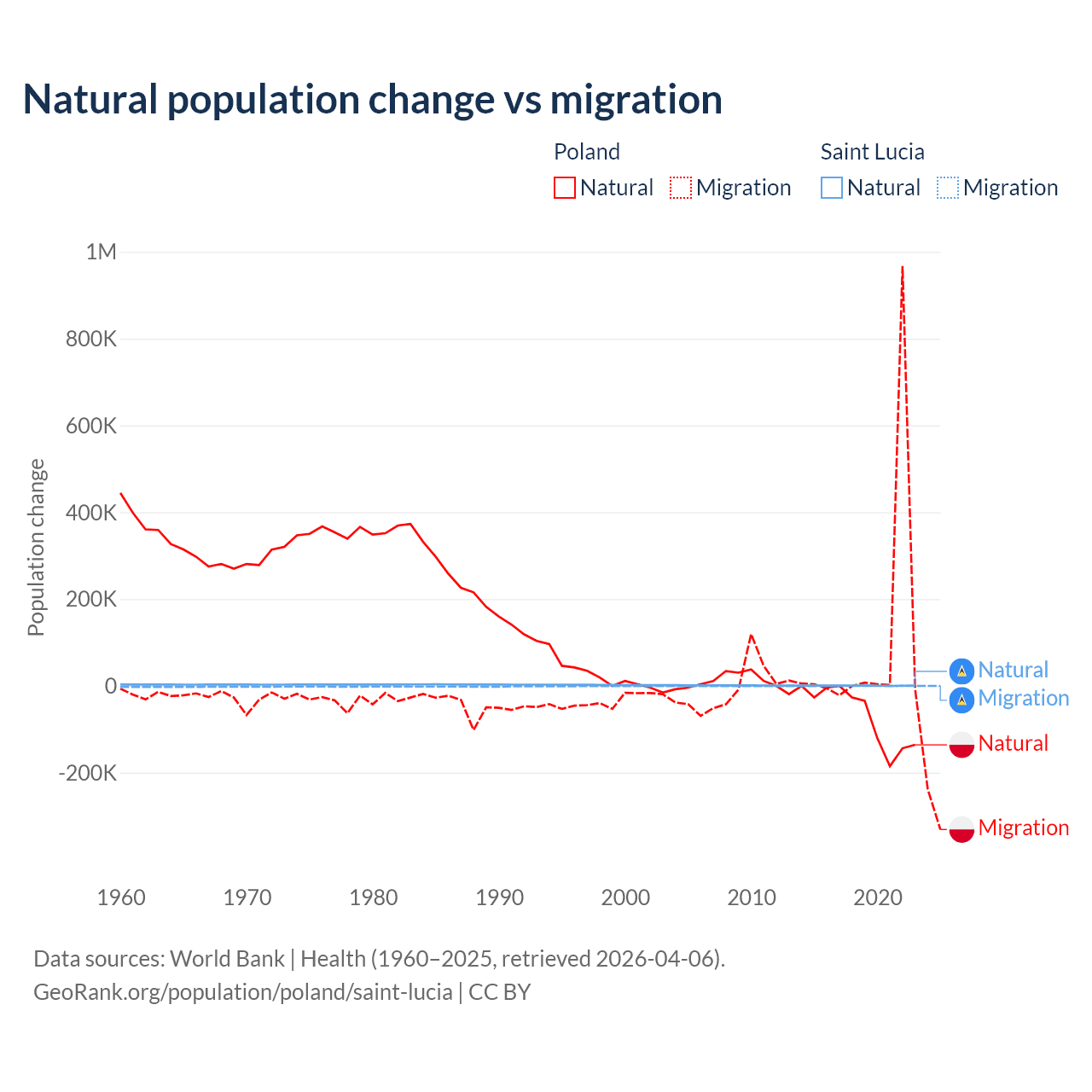 Over the last 10 years, 41.4% of the population change in Poland is from natural causes (a loss of 675,443 people) and 58.6% is from migration (a gain of 955,766 people). In Saint Lucia 95.7% is from natural causes (a gain of 6,039 people) and 4.31% is from migration (a loss of 272 people).