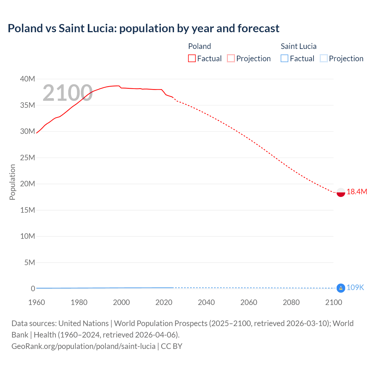 - Since 2006, the population of Poland has decreased from 38.1M people to 35.8M (6.12% decline), while Saint Lucia has grown from 167K to 181K (8.4% growth).