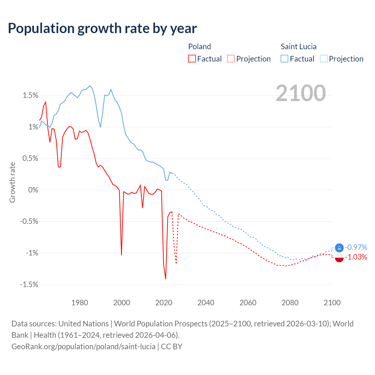 - For the last 10 years, Poland has had an average growth rate of -0.36% per year vs +0.33% in Saint Lucia.