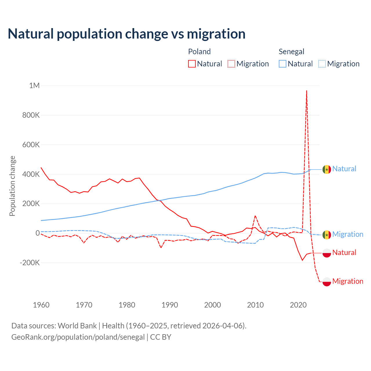 Over the last 10 years, 41.4% of the population change in Poland is from natural causes (a loss of 675,443 people) and 58.6% is from migration (a gain of 955,766 people). In Senegal 93.9% is from natural causes (a gain of 4,089,205 people) and 6.13% is from migration (a gain of 267,266 people).