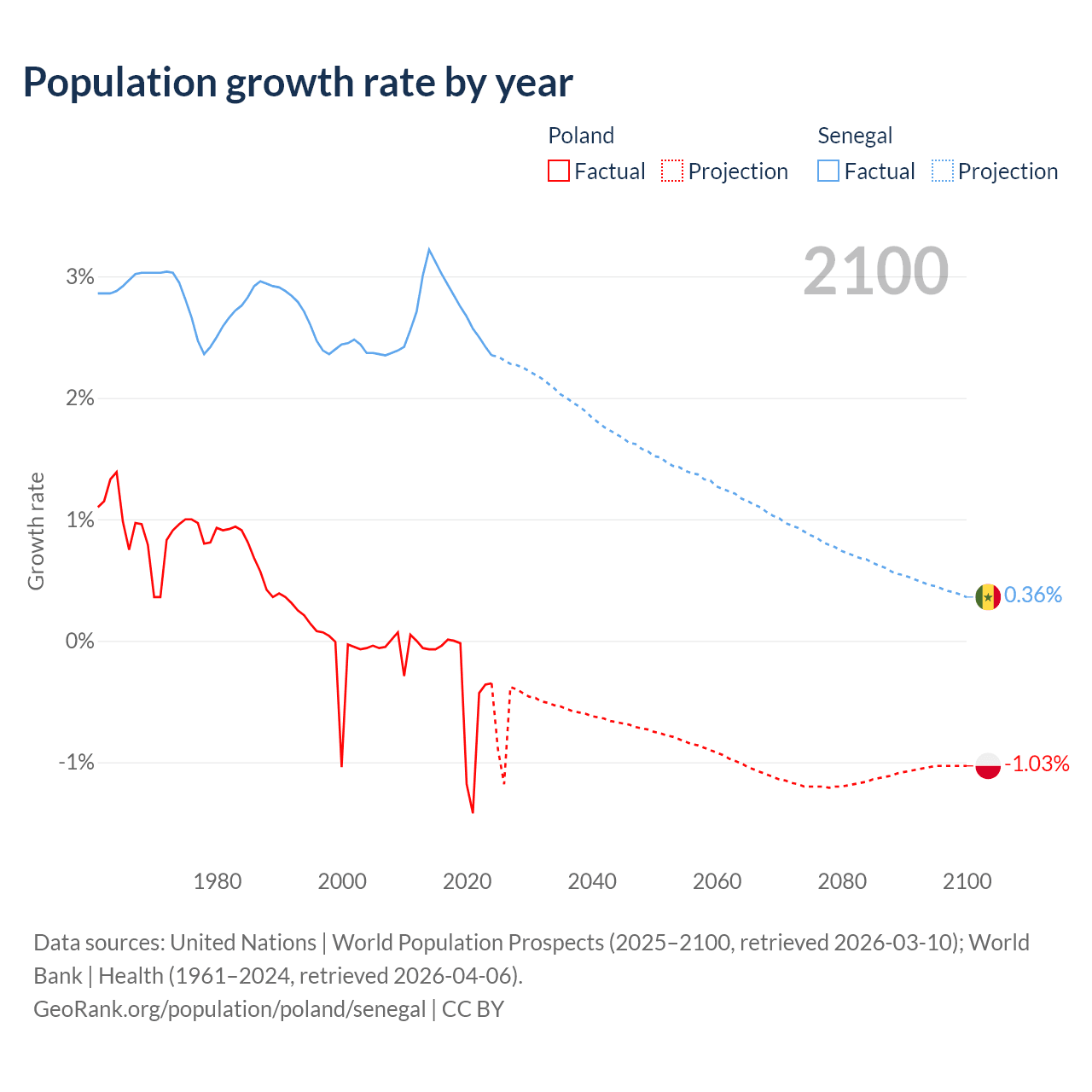 - For the last 10 years, Poland has had an average growth rate of -0.36% per year vs +2.76% in Senegal.