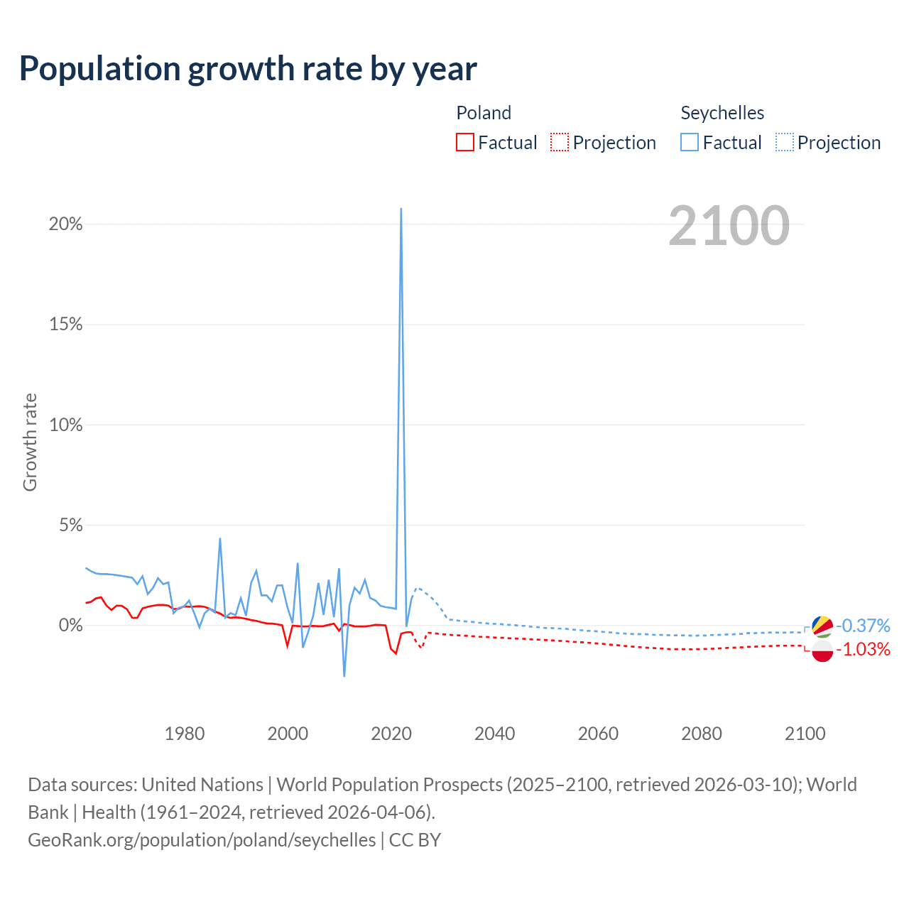 - For the last 10 years, Poland has had an average growth rate of -0.36% per year vs +2.9% in the Seychelles.