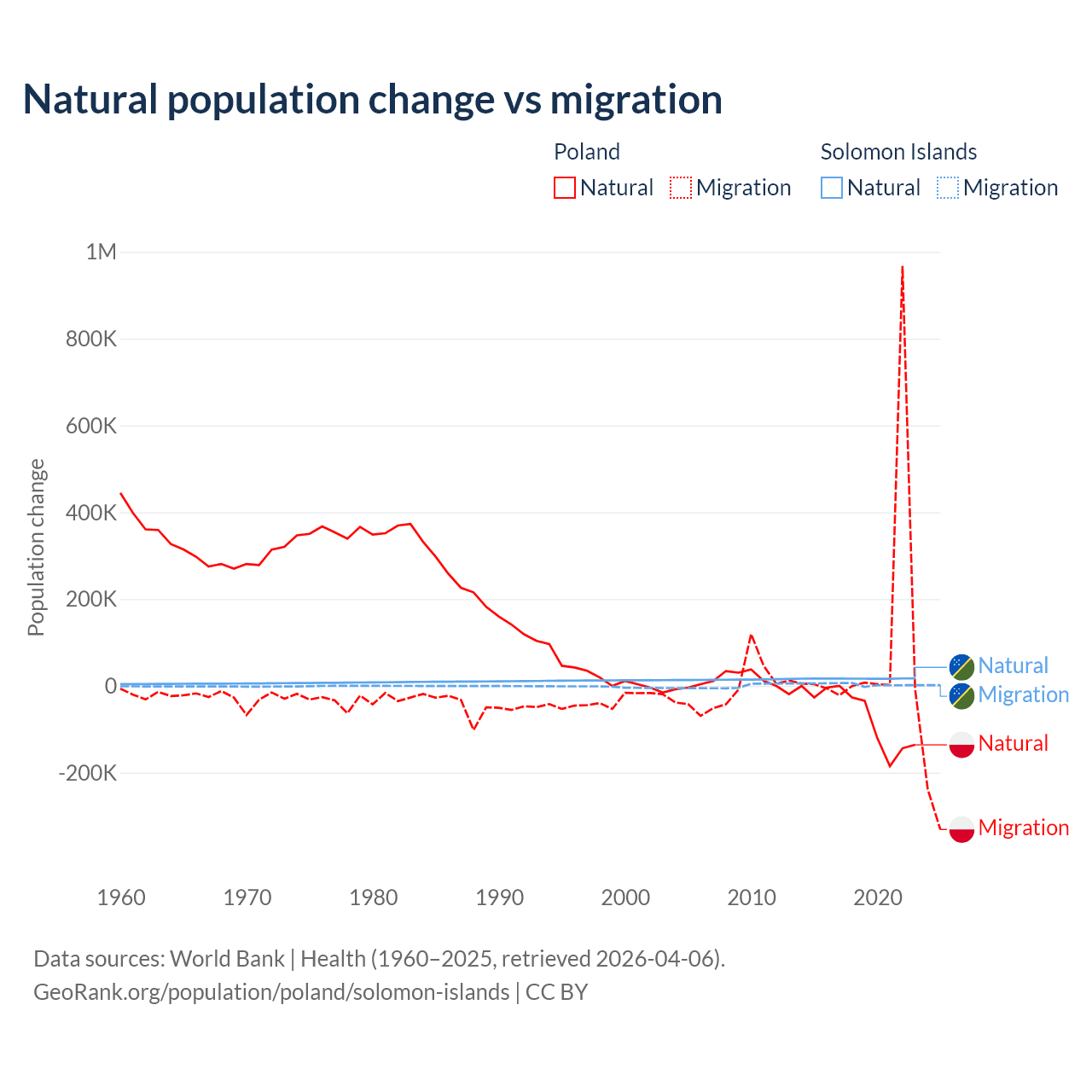 Over the last 10 years, 41.4% of the population change in Poland is from natural causes (a loss of 675,443 people) and 58.6% is from migration (a gain of 955,766 people). In the Solomon Islands 82.8% is from natural causes (a gain of 168,727 people) and 17.2% is from migration (a gain of 35,031 people).