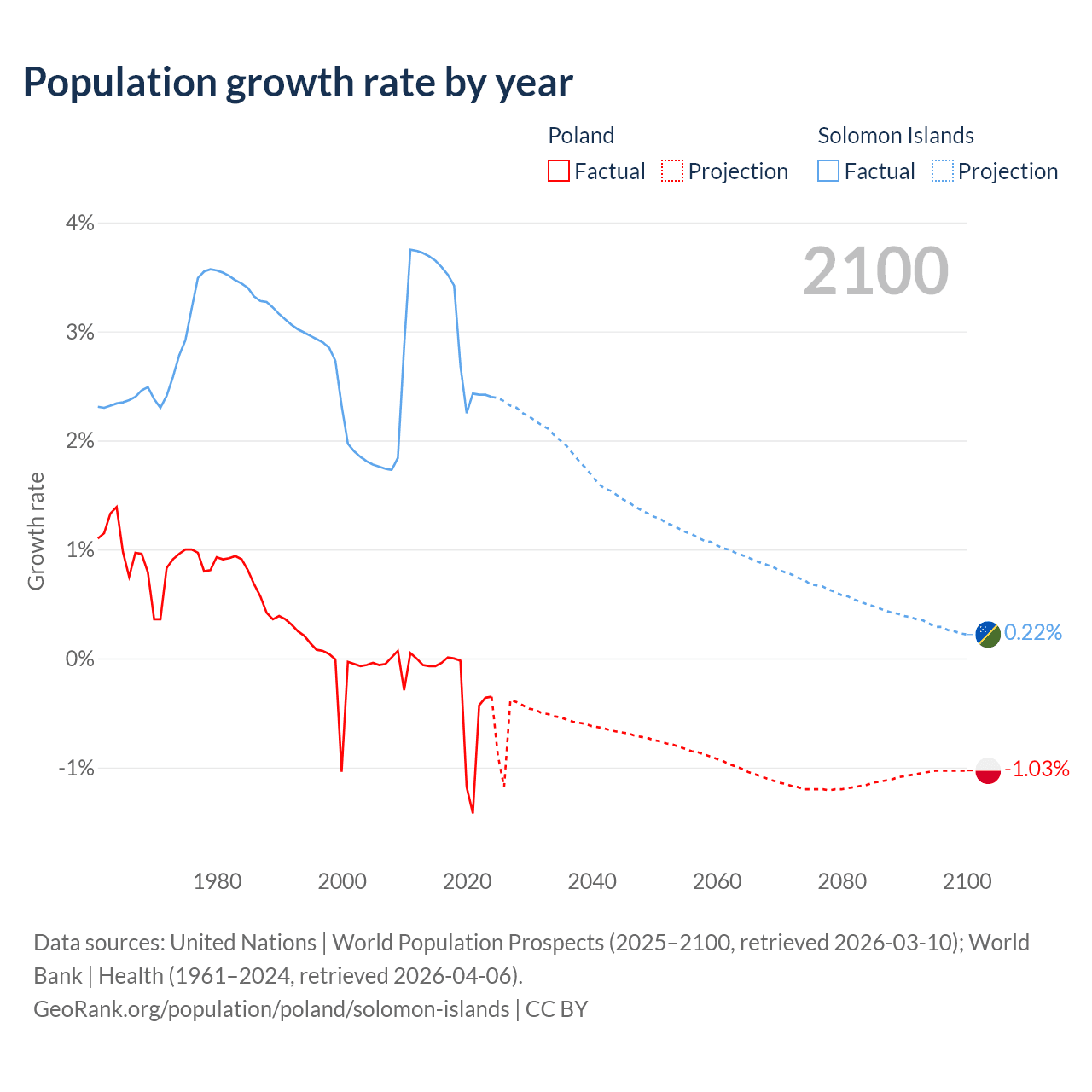 - For the last 10 years, Poland has had an average growth rate of -0.36% per year vs +2.95% in the Solomon Islands.
