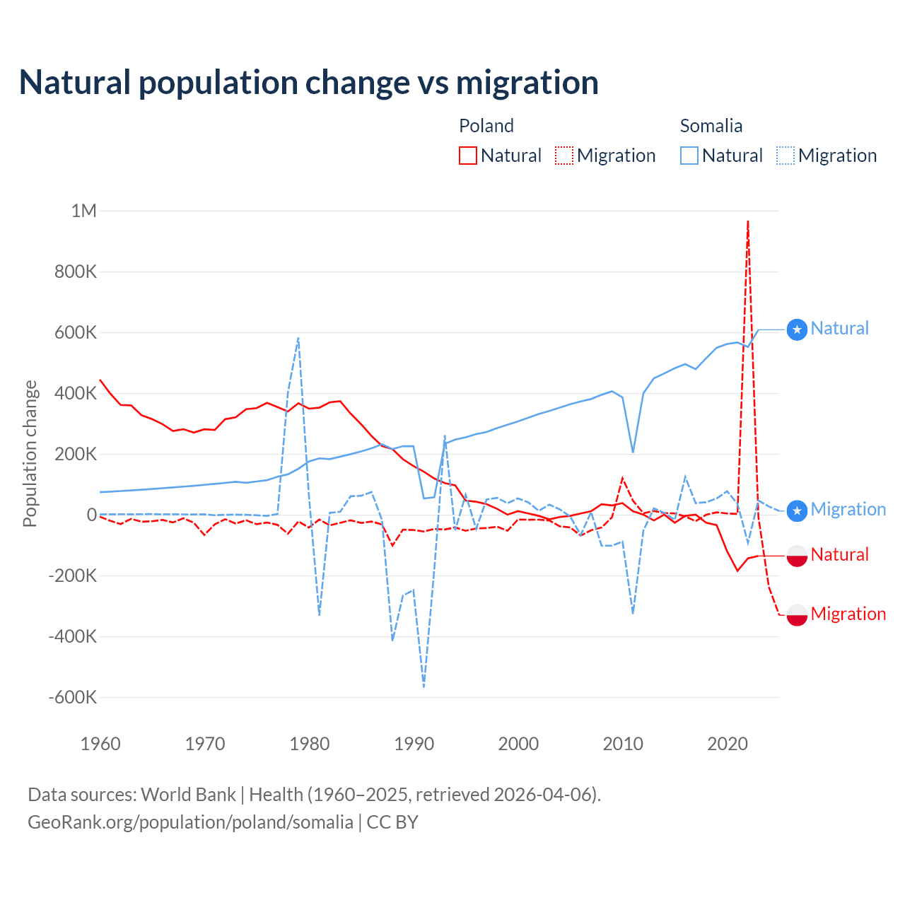 Over the last 10 years, 41.4% of the population change in Poland is from natural causes (a loss of 675,443 people) and 58.6% is from migration (a gain of 955,766 people). In Somalia 94.4% is from natural causes (a gain of 5,270,105 people) and 5.58% is from migration (a gain of 311,487 people).