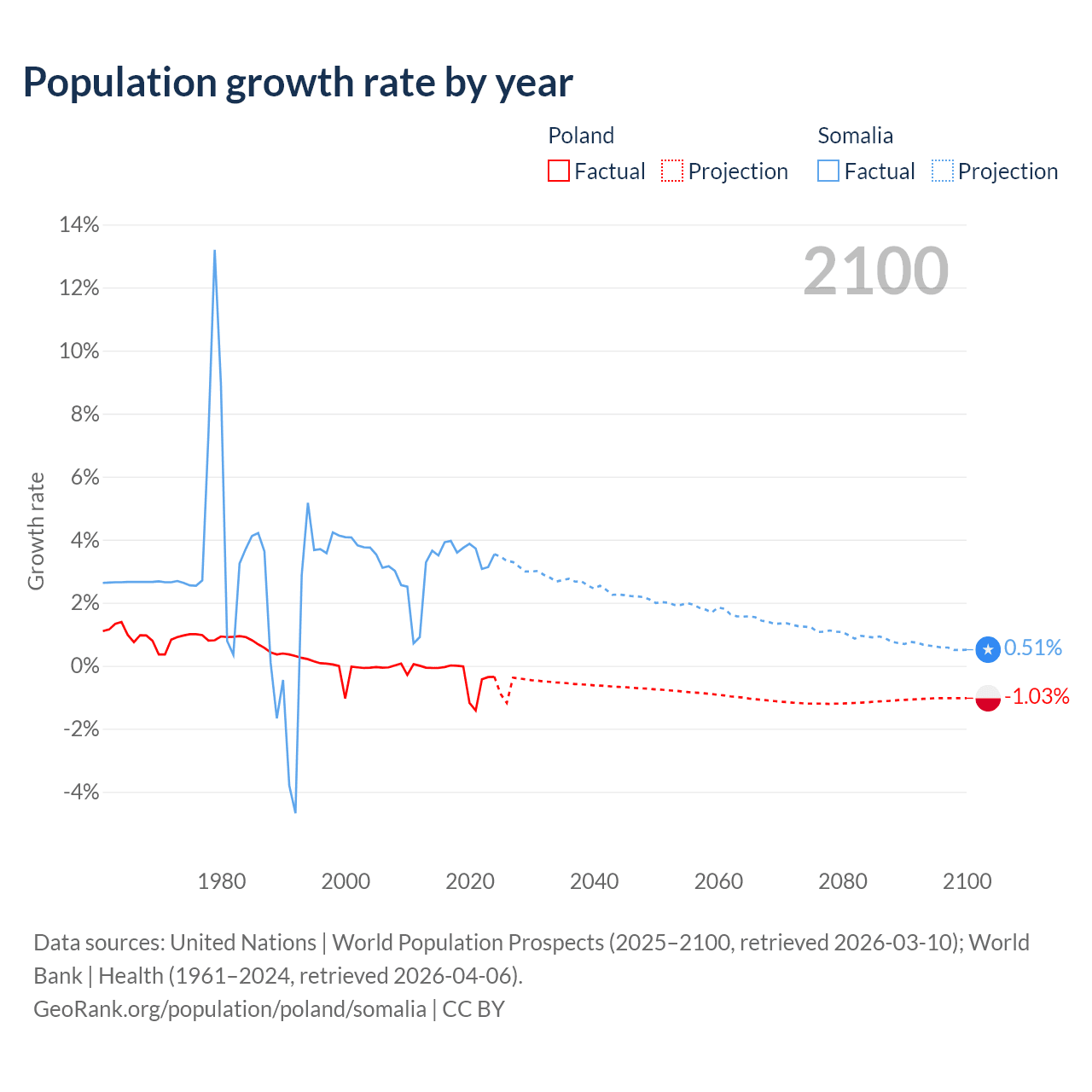 - For the last 10 years, Poland has had an average growth rate of -0.36% per year vs +3.61% in Somalia.