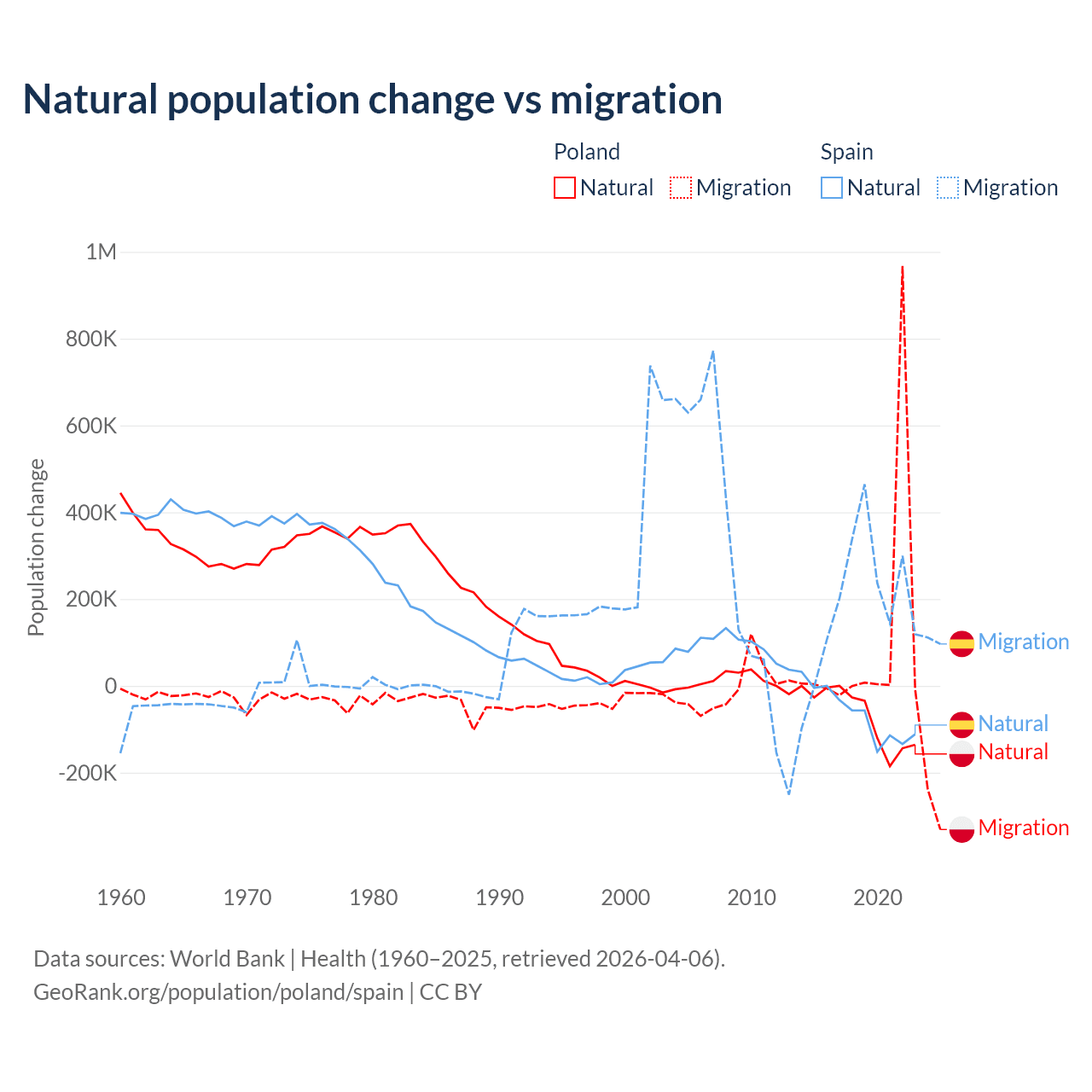 Over the last 10 years, 41.4% of the population change in Poland is from natural causes (a loss of 675,443 people) and 58.6% is from migration (a gain of 955,766 people). In Spain 25.8% is from natural causes (a loss of 627,829 people) and 74.2% is from migration (a gain of 1,810,127 people).