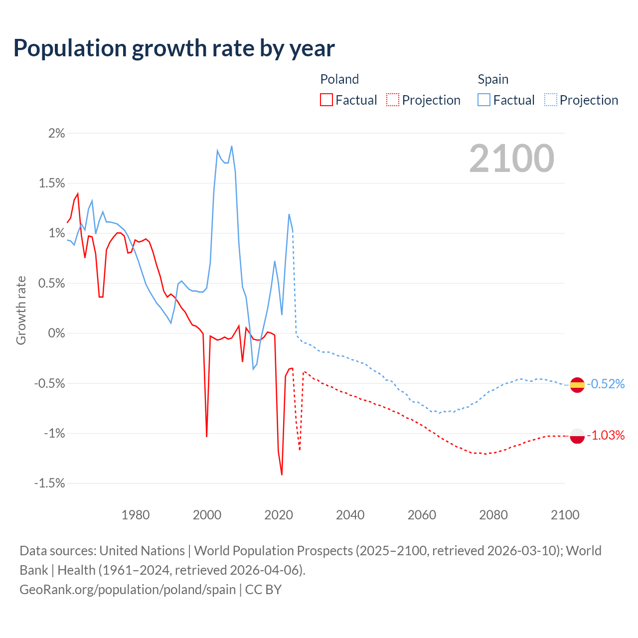 - For the last 10 years, Poland has had an average growth rate of -0.36% per year vs +0.43% in Spain.