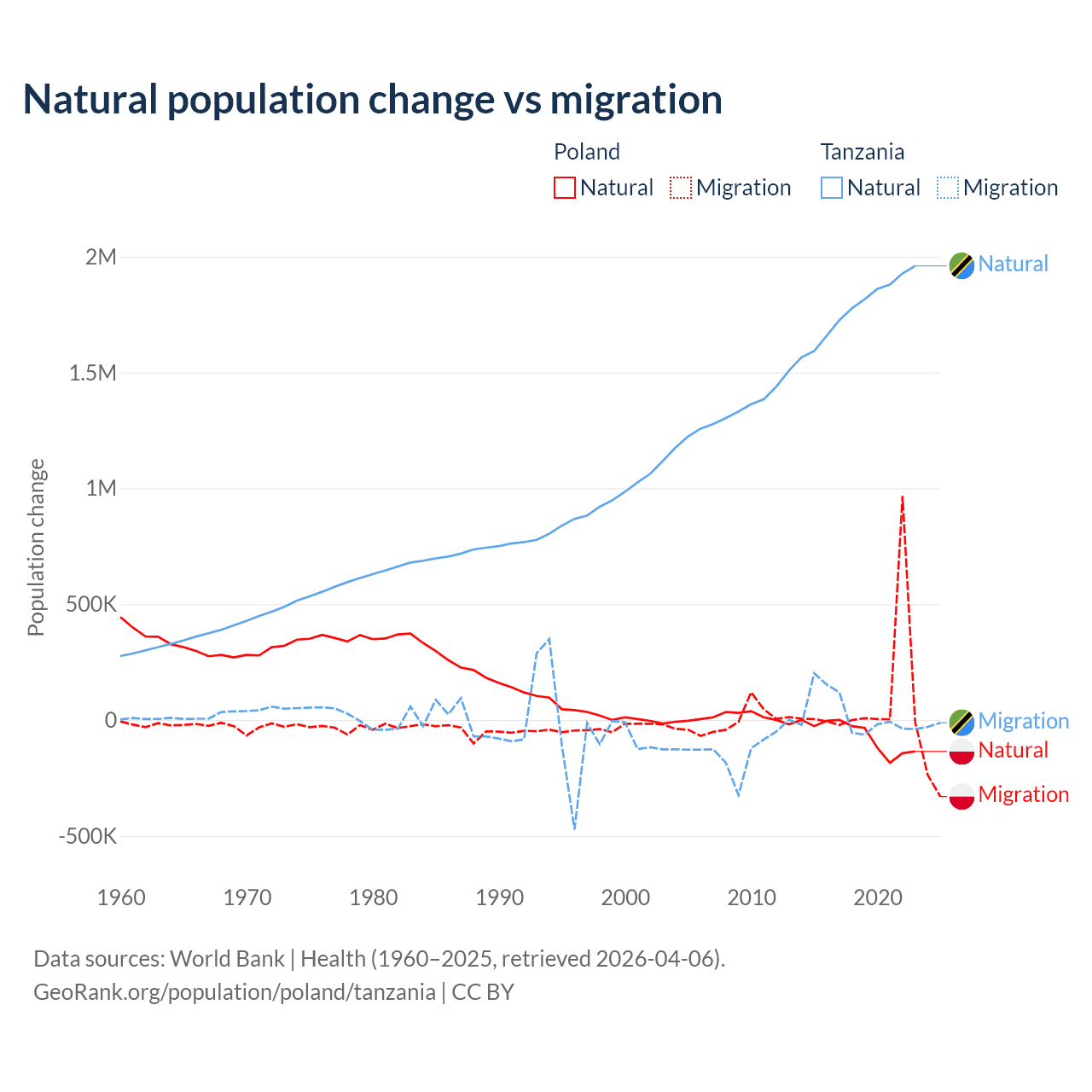 Over the last 10 years, 41.4% of the population change in Poland is from natural causes (a loss of 675,443 people) and 58.6% is from migration (a gain of 955,766 people). In Tanzania 98.7% is from natural causes (a gain of 17,769,541 people) and 1.27% is from migration (a gain of 229,466 people).