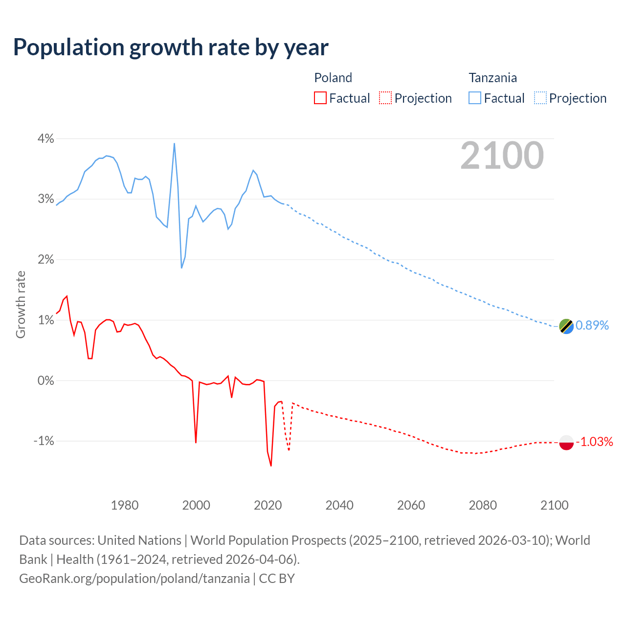 - For the last 10 years, Poland has had an average growth rate of -0.36% per year vs +3.13% in Tanzania.
