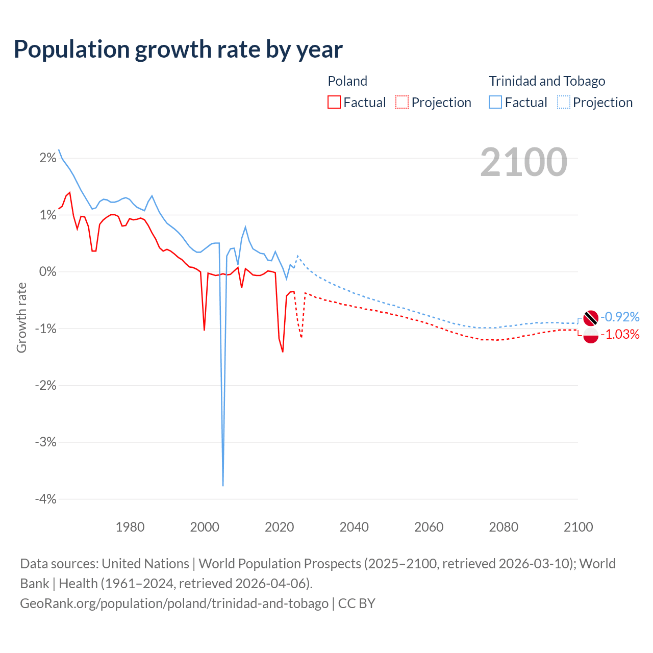 - For the last 10 years, Poland has had an average growth rate of -0.36% per year vs +0.19% in Trinidad and Tobago.