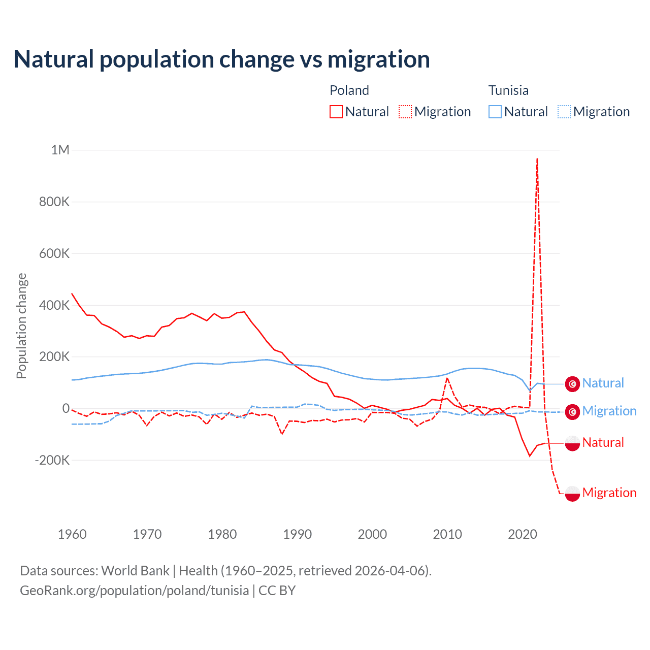 Over the last 10 years, 41.4% of the population change in Poland is from natural causes (a loss of 675,443 people) and 58.6% is from migration (a gain of 955,766 people). In Tunisia 86.3% is from natural causes (a gain of 1,225,079 people) and 13.7% is from migration (a loss of 195,011 people).