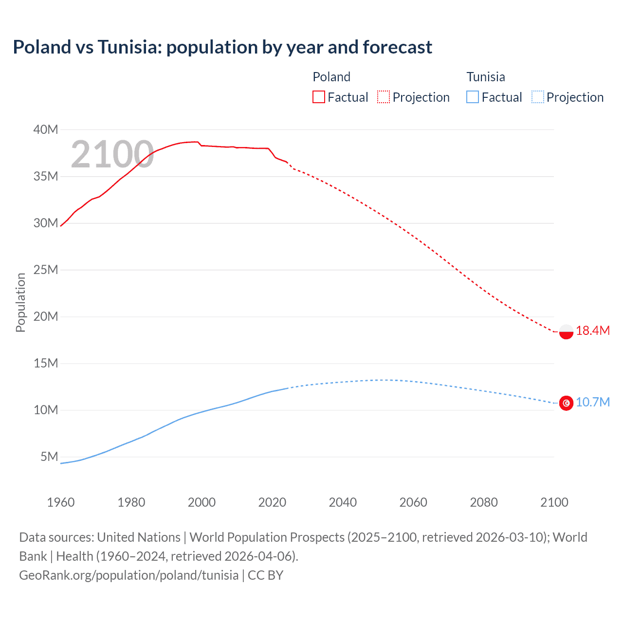 - Since 2006, the population of Poland has decreased from 38.1M people to 35.8M (6.12% decline), while Tunisia has grown from 10.3M to 12.4M (20.2% growth).