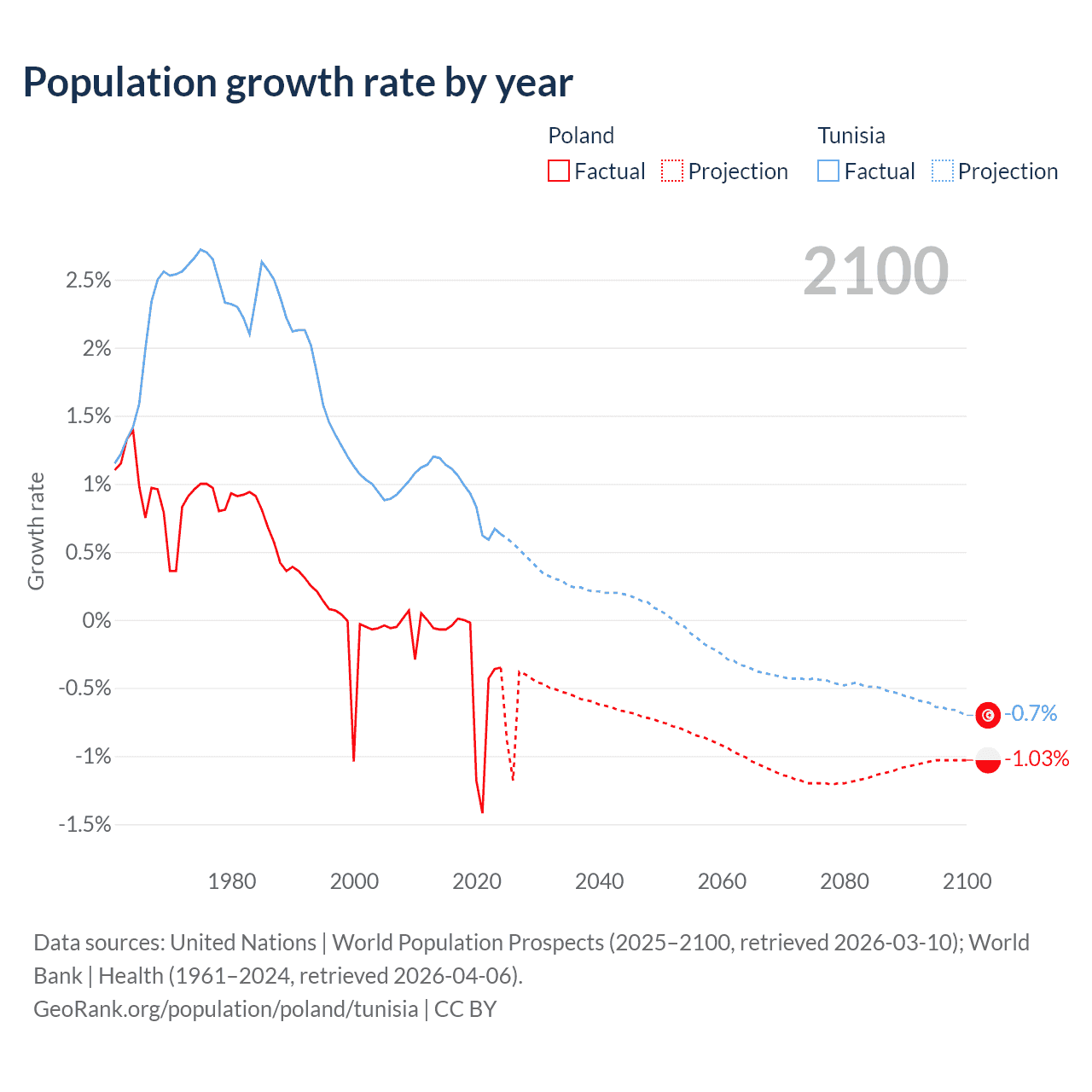 - For the last 10 years, Poland has had an average growth rate of -0.36% per year vs +0.89% in Tunisia.