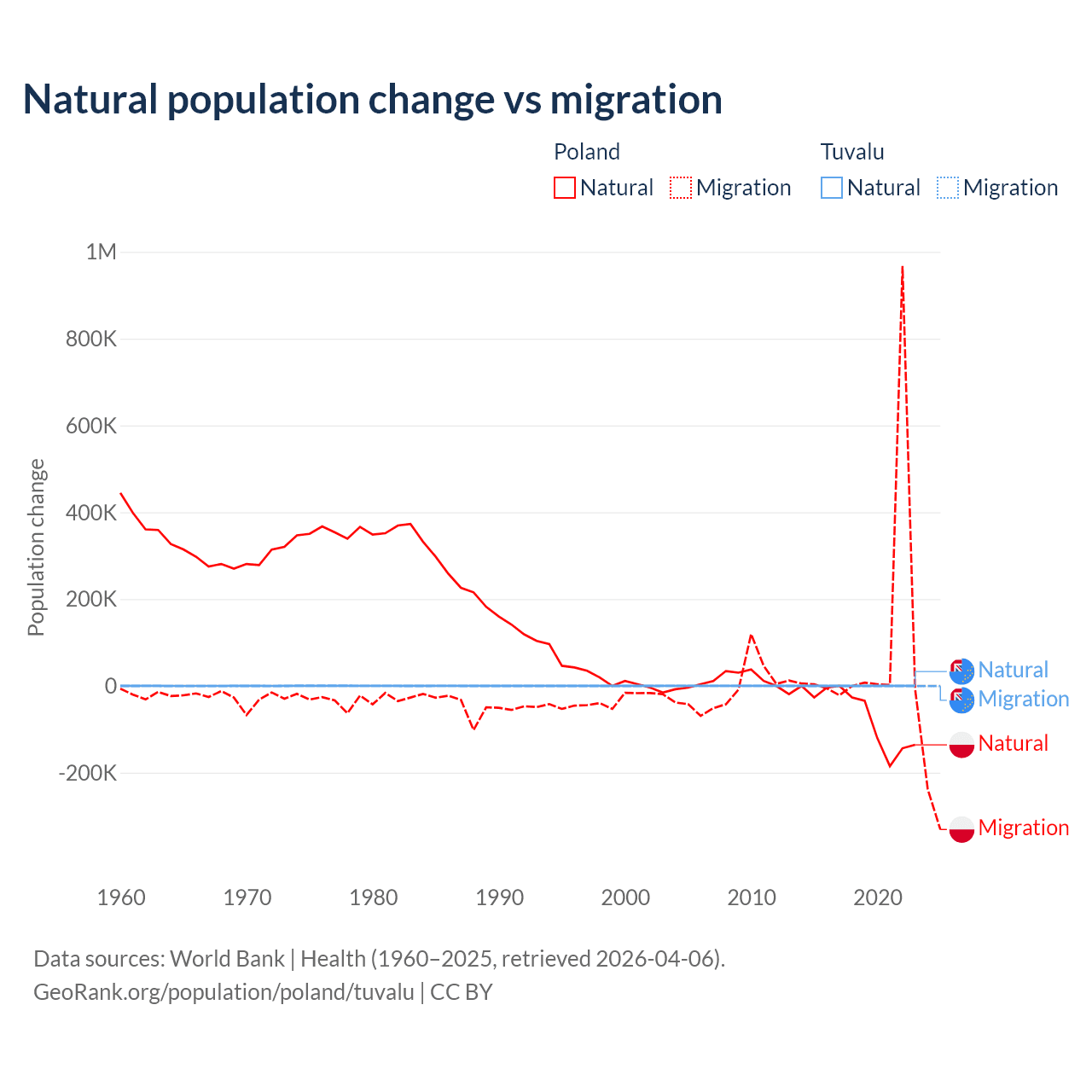 Over the last 10 years, 41.4% of the population change in Poland is from natural causes (a loss of 675,443 people) and 58.6% is from migration (a gain of 955,766 people). In Tuvalu 35.5% is from natural causes (a gain of 1,556 people) and 64.5% is from migration (a loss of 2,827 people).