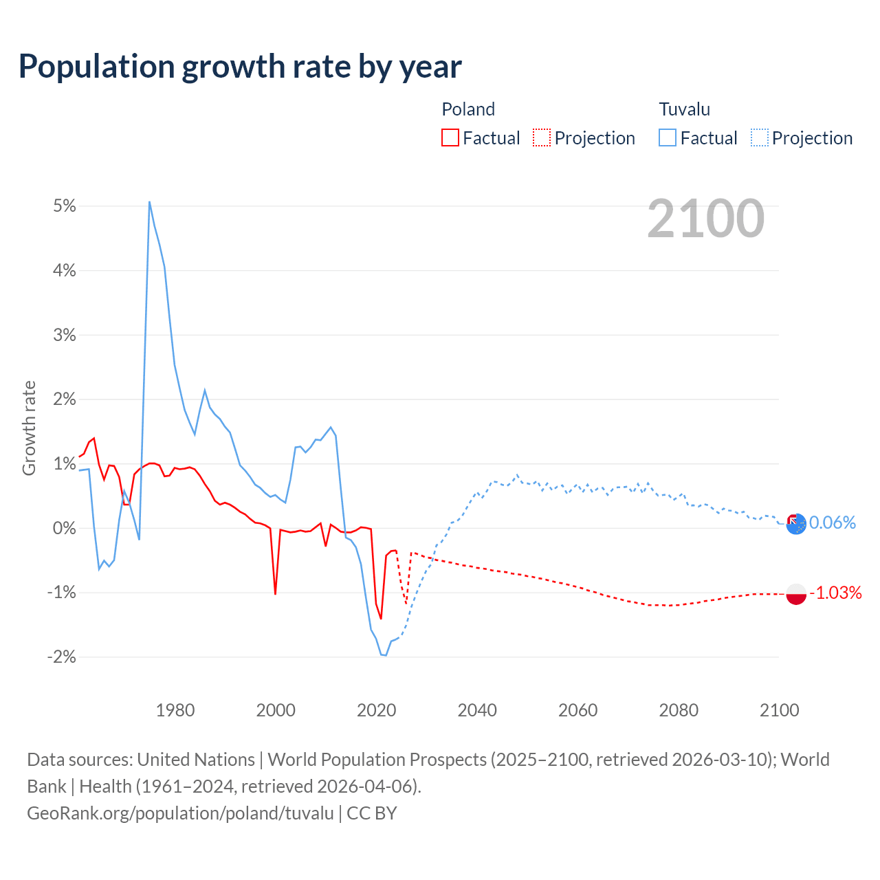 - For the last 10 years, Poland has had an average growth rate of -0.36% per year vs -1.19% in Tuvalu.