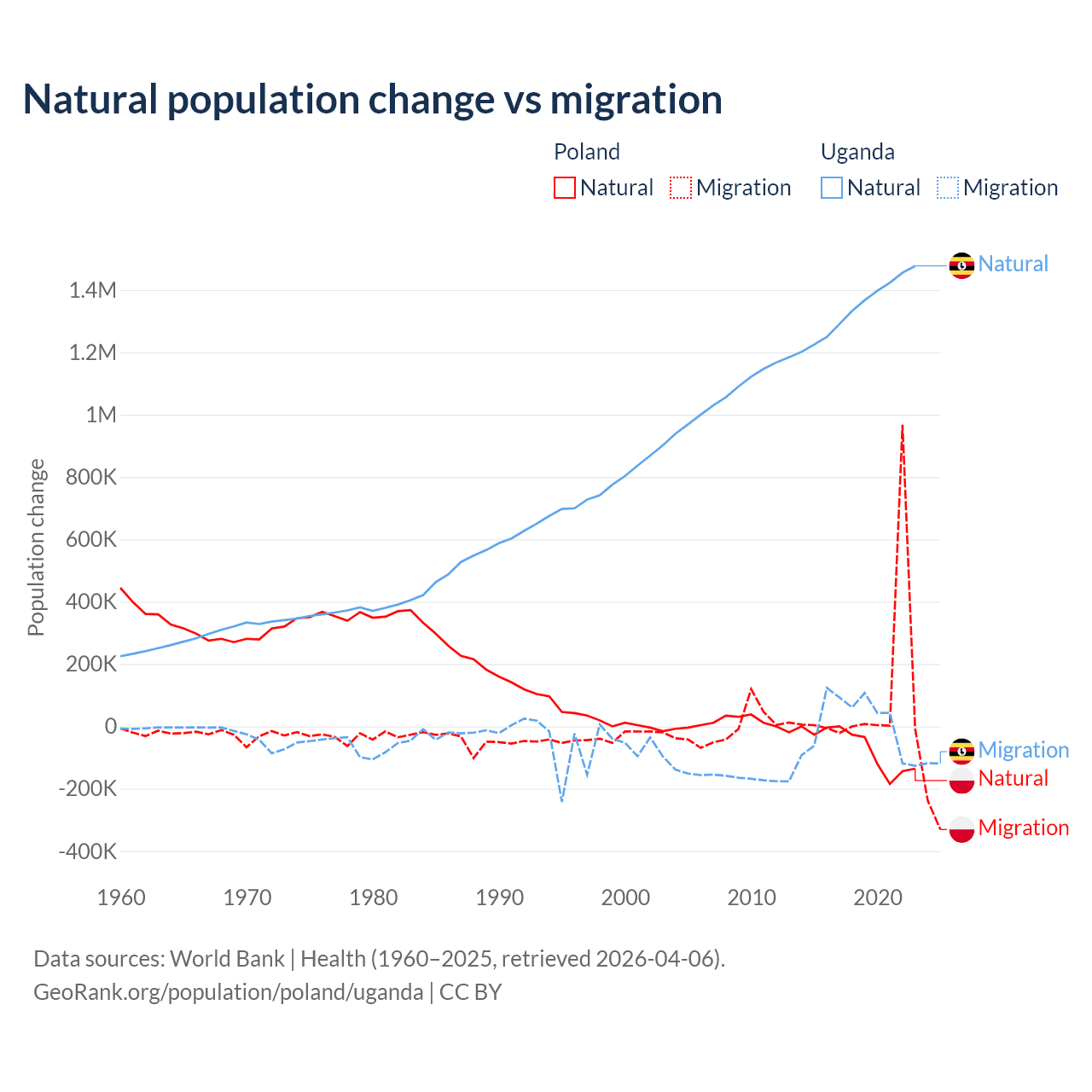 Over the last 10 years, 41.4% of the population change in Poland is from natural causes (a loss of 675,443 people) and 58.6% is from migration (a gain of 955,766 people). In Uganda 99.5% is from natural causes (a gain of 13,419,712 people) and 0.53% is from migration (a gain of 71,457 people).
