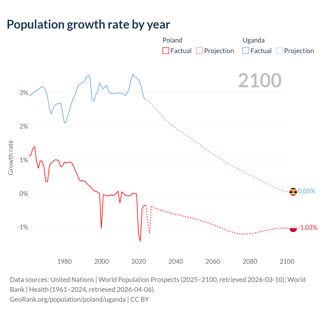 - For the last 10 years, Poland has had an average growth rate of -0.36% per year vs +3.21% in Uganda.
