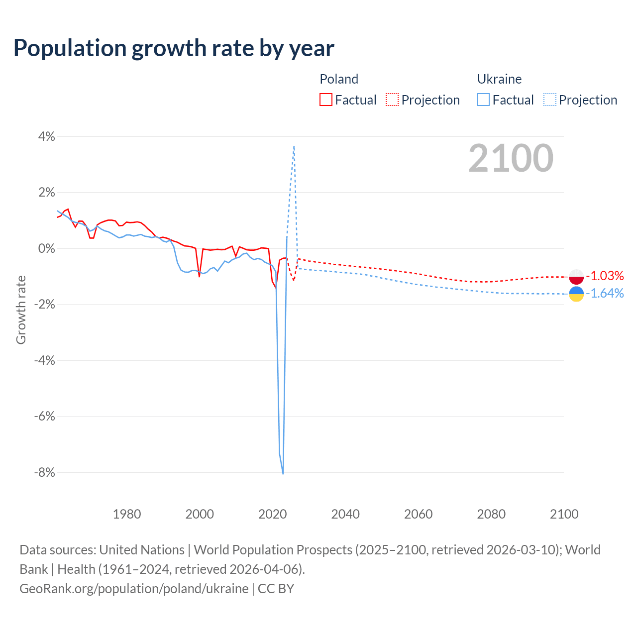 - For the last 10 years, Poland has had an average growth rate of -0.36% per year vs -1.74% in Ukraine.